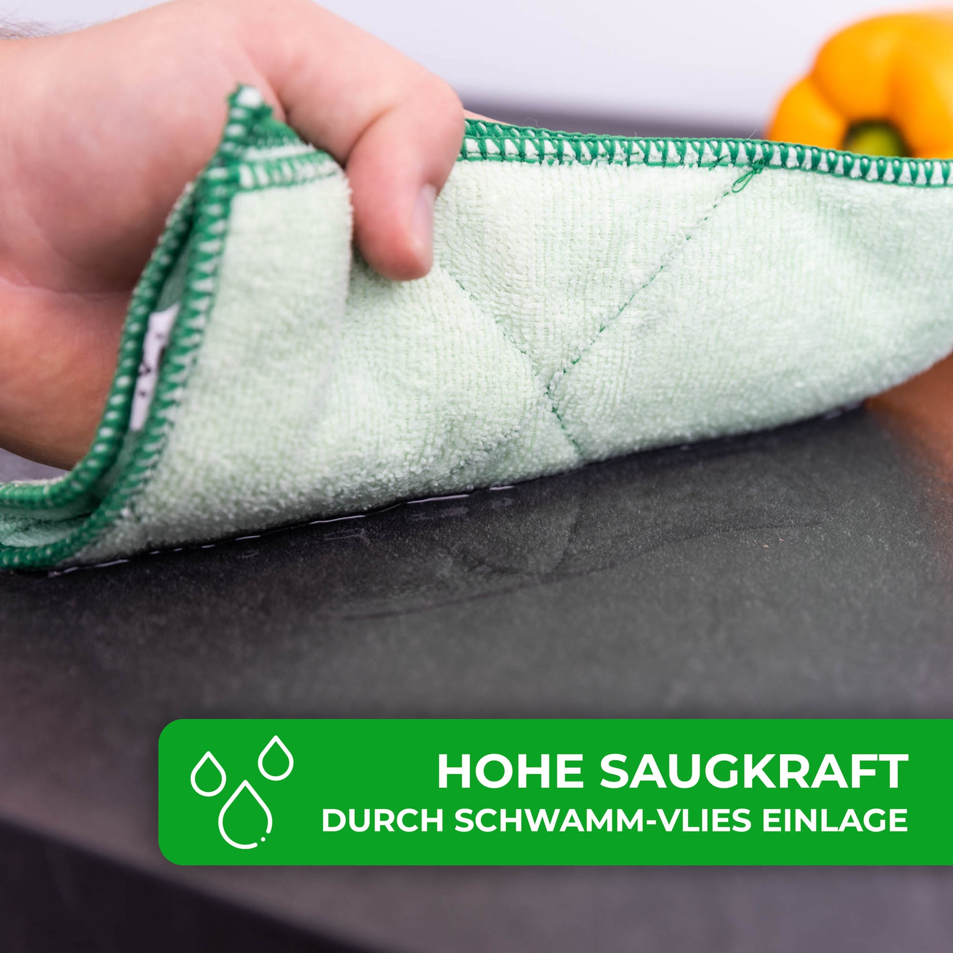 - Zudem garantiert das Vorreinigungstuch eine hohe Aufnahmefähigkeit für Schmutzpartikel und Feuchtigkeit, die durch die Schwamm-Vlies Einlage im Tuch festgehalten werden.