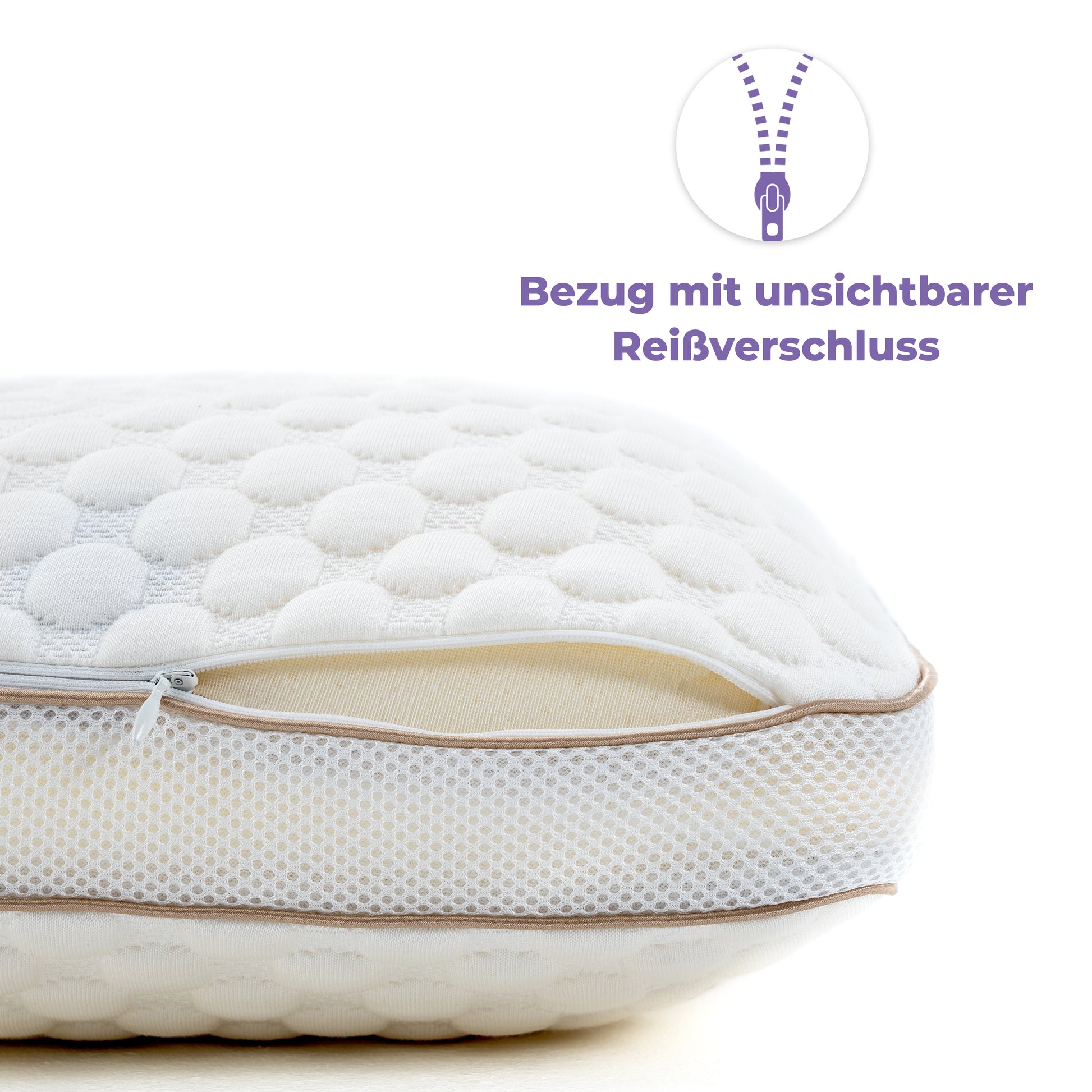 Der Kern besteht aus High-Tech Viscoschaum mit Gedächtnisfunktion, der optimale Unterstützung für Nacken, Schultern und Kopf bietet. Er ist temperaturausgleichend, atmungsaktiv, antibakteriell und allergikerfreundlich.