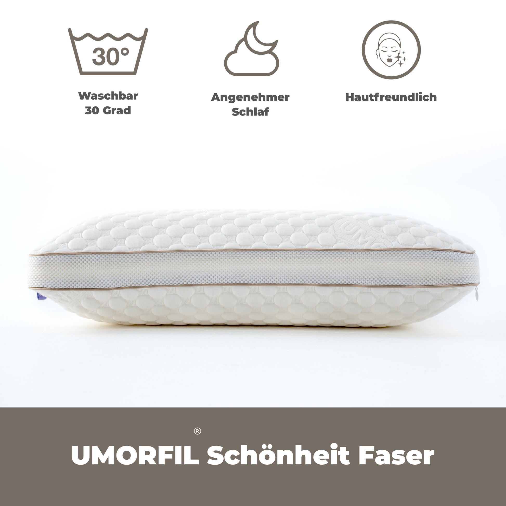 Dieses hochwertige Viscoschaum-Kissen, das auch als “Kollagen Schönheit Kissen” bezeichnet wird, wurde entwickelt, um Ihren Schlaf zu verbessern und gleichzeitig die Schönheit Ihrer Haut zu fördern. Es sorgt für ein angenehmes Schlafklima dank Umorfil® Beauty Fiber® Technologie, die für eine weiche Struktur und seidige Berührung sorgt.