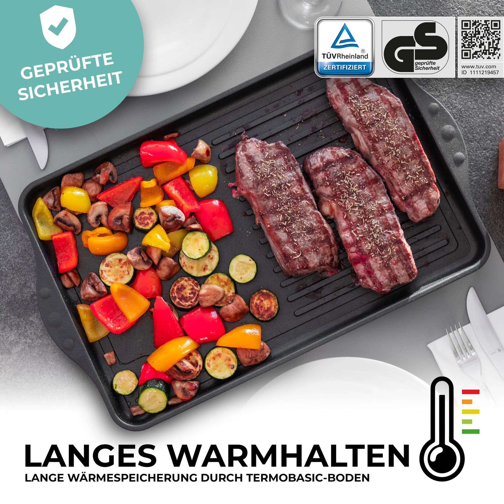 - Mit dem modernen, klassischen Design ist die Grillplatte auch auf dem Tisch als Serviceplatte ein echter Hingucker.