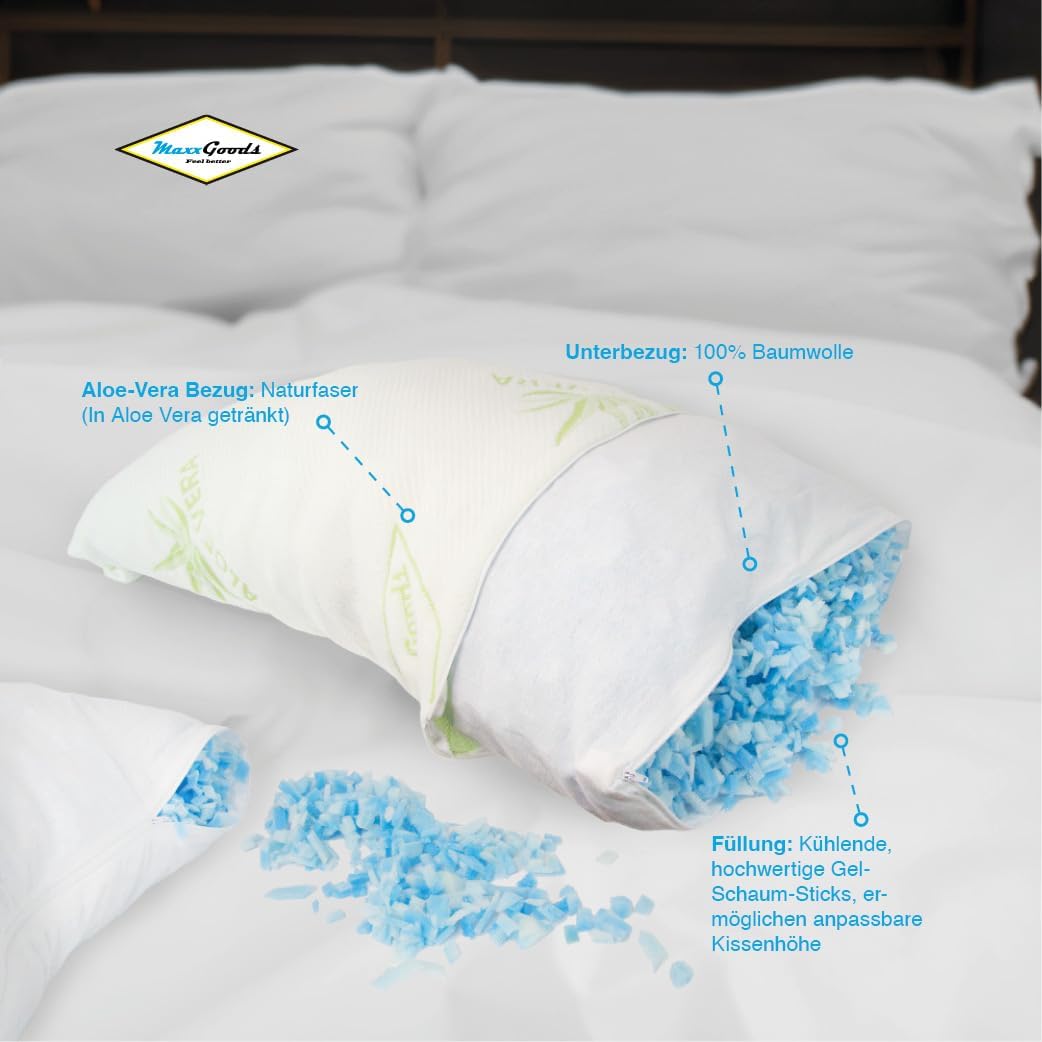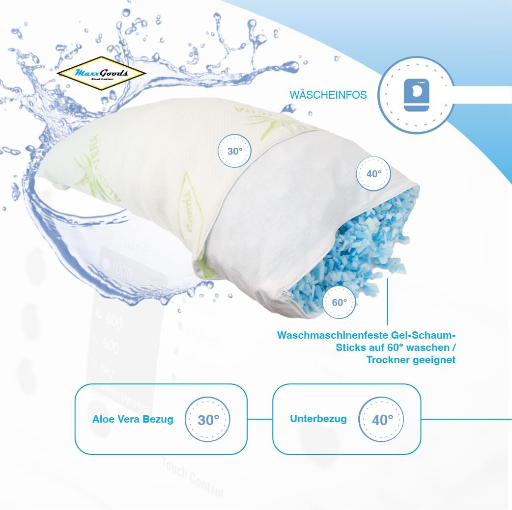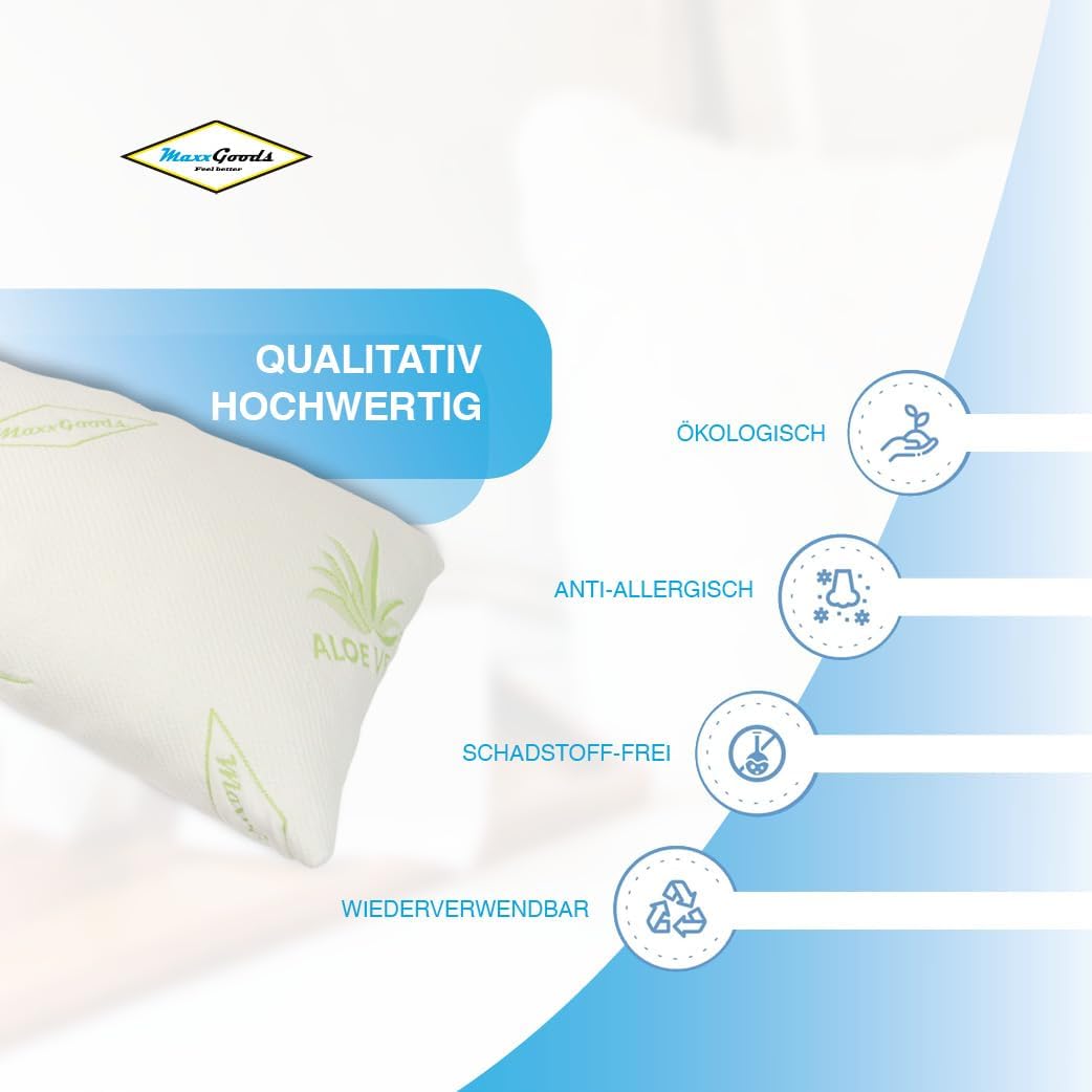 - [PREMIUM MATERIALIEN] Das MaxxGoods Kissen besteht aus hautfreundlichem Aloe Vera Bezug und einem weichen Baumwollunterbezug (beim großen Kissen). Diese Materialien sind atmungsaktiv und unterstützen ein angenehmes Schlafklima. Beide Bezüge sind maschinenwaschbar, was die Pflege besonders einfach und hygienisch macht.
