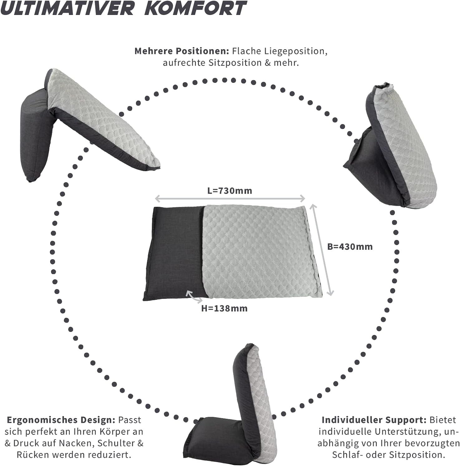 - [ULTIMATIVER KOMFORT] Genießen Sie Komfort auf einem neuen Level: Das Klappkissen lässt sich in mehrere Positionen verstellen - ob flach zum Liegen oder aufrecht zum Sitzen. Ergonomisch designt, reduziert es den Druck auf Nacken, Schulter und Rücken.